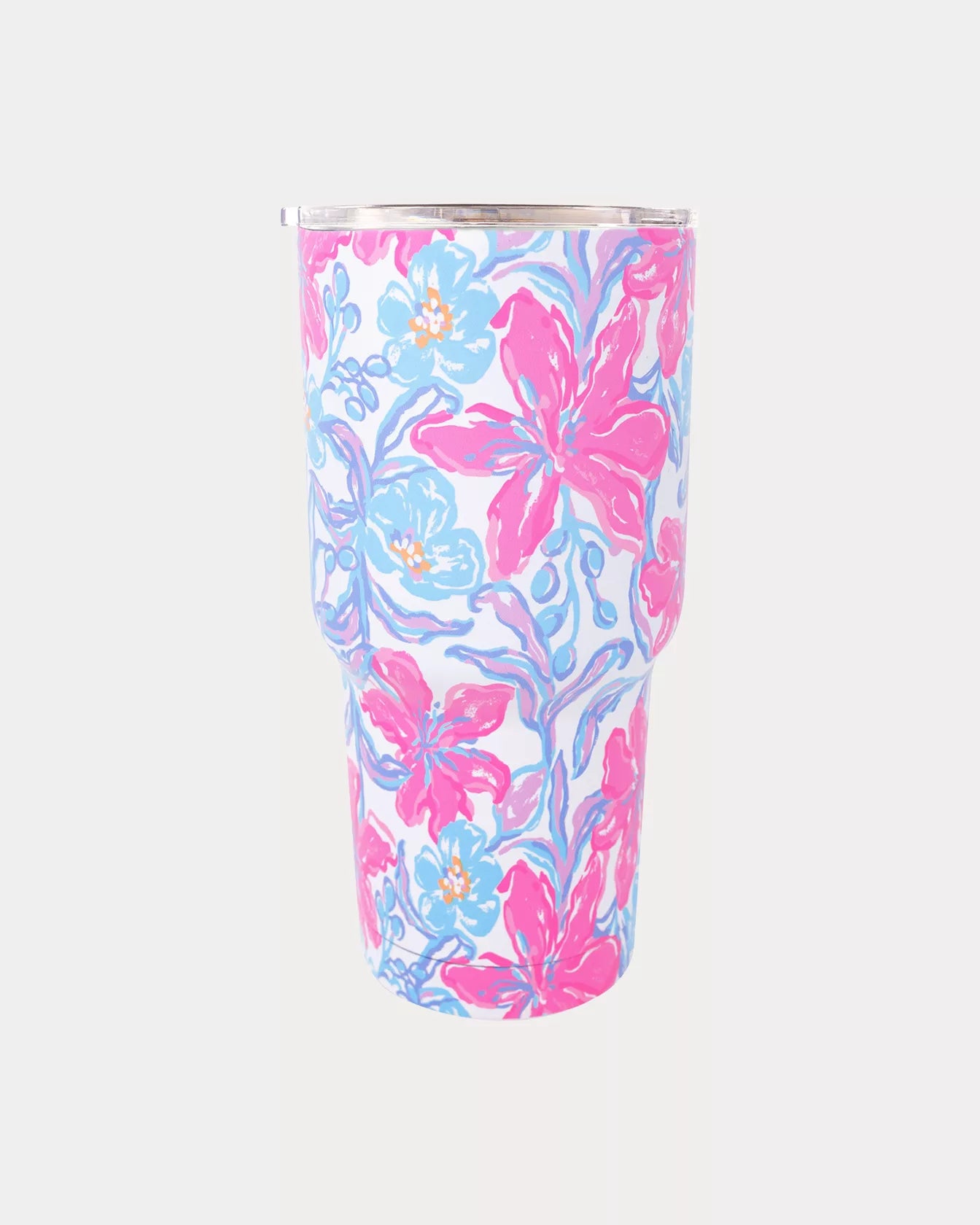 - Stainless steel tumbler with a double wall body and a clear acrylic lid with a silicone seal.
