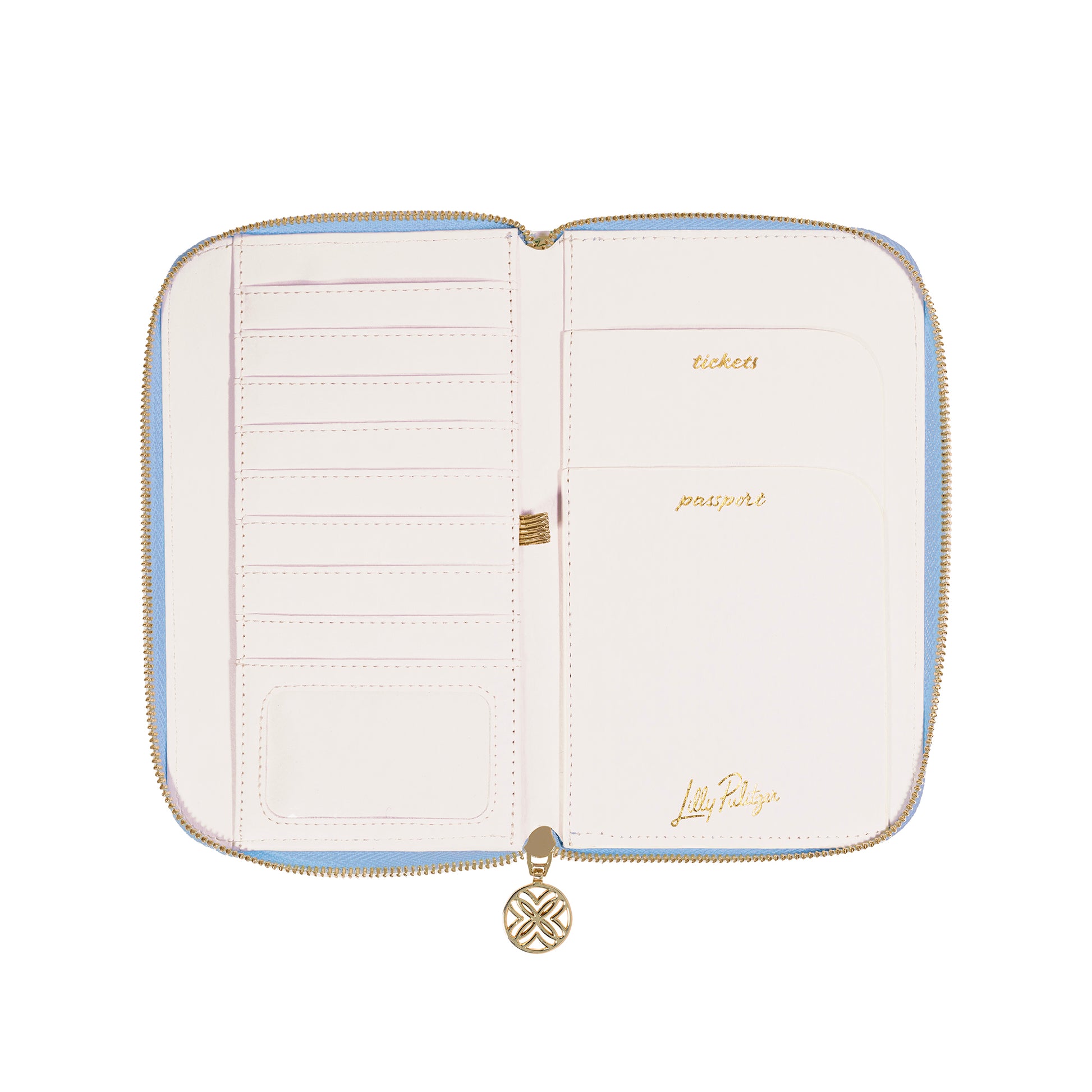 Safely stow your passport and other travel essentials in this Bamboo Logo Trellis printed zipper wallet. 2 interior flaps, 10 interior pockets, an interior cash pocket, and an exterior pocket on the back make it easy to store cards, tickets, and more, while a gold logo plaque and matching bamboo zipper pull add signature Lilly style.