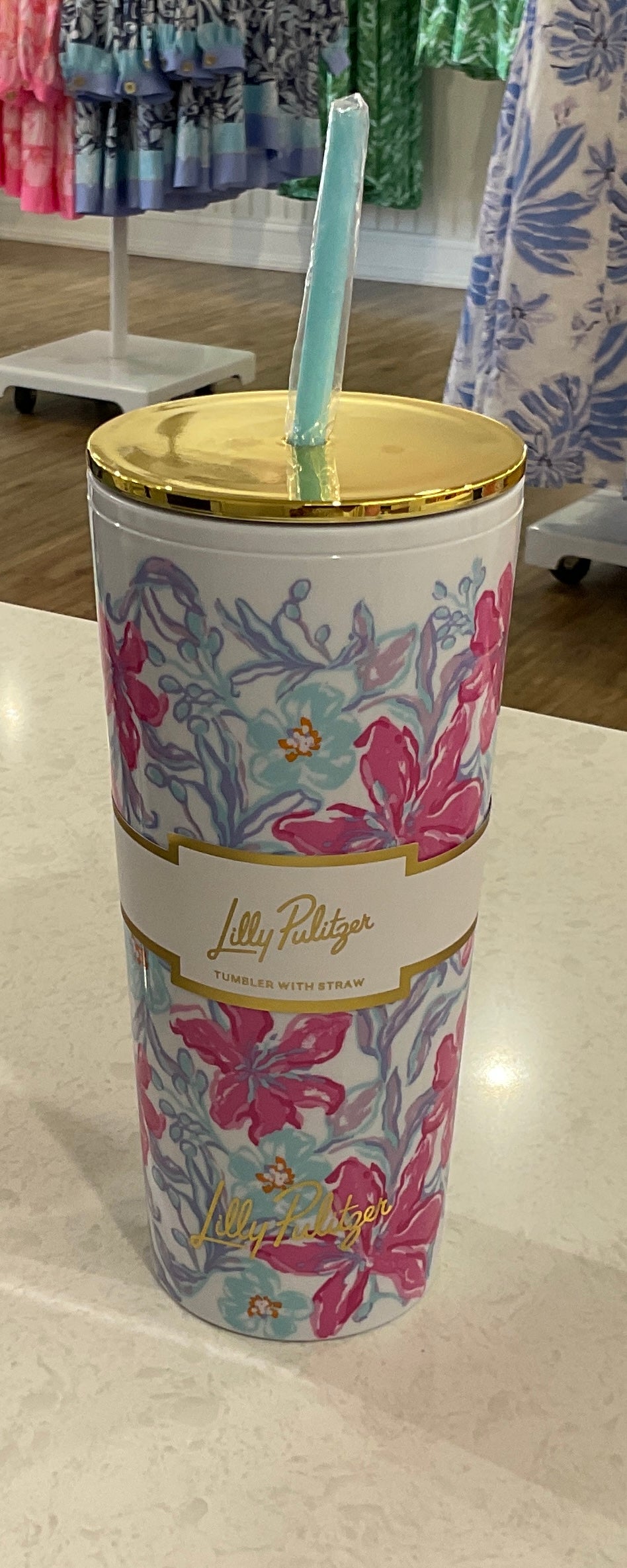 - Printed acrylic tumbler with a straw and twist-off lid.