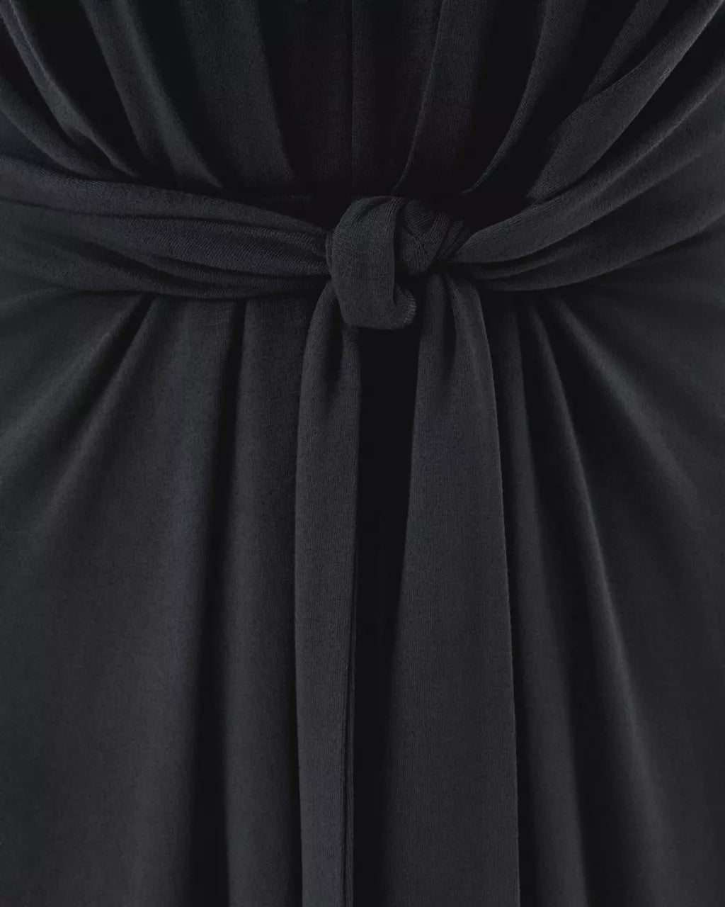 - Fit-and-flare dress with a deep v-neckline, cut-in armholes, and a functional front tie detail at the waist.